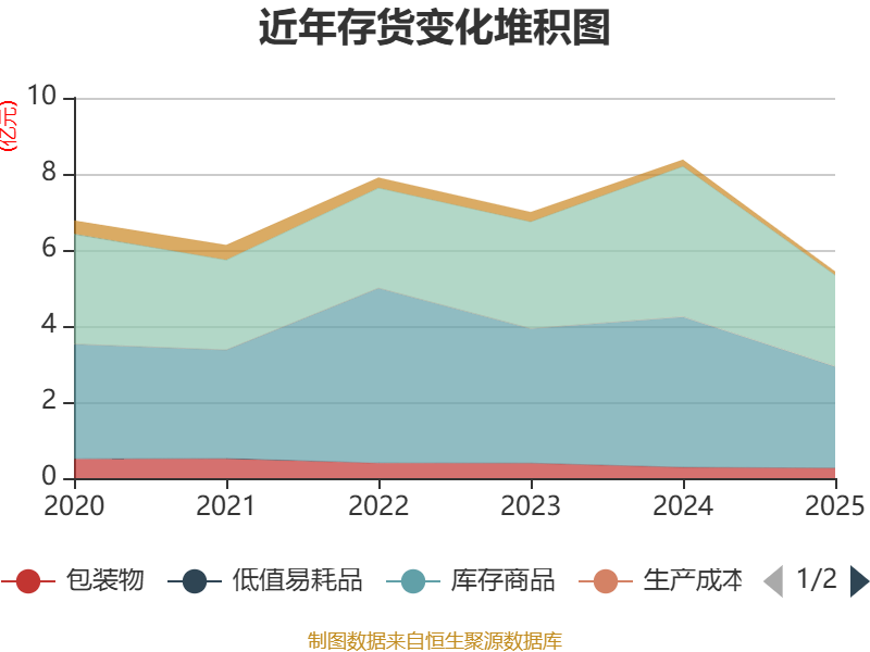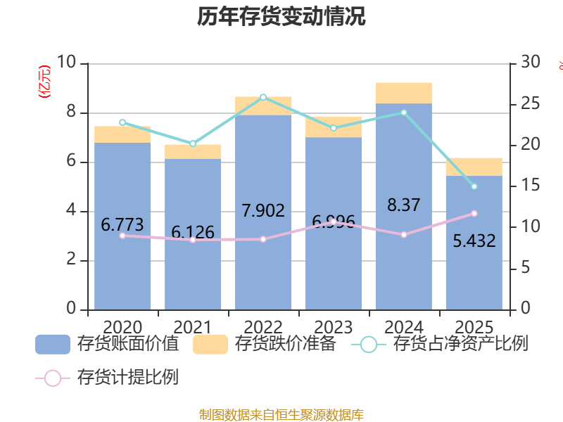 从存货变动来看,截至2025年末,公司存货账面价值为5.43亿元,占净资产的14.99%,较上年末减少2.94亿元。其中,存货跌价准备为7200.9万元,计提比例为11.7%。