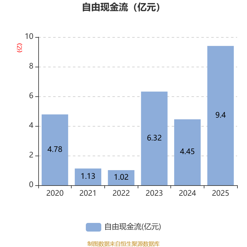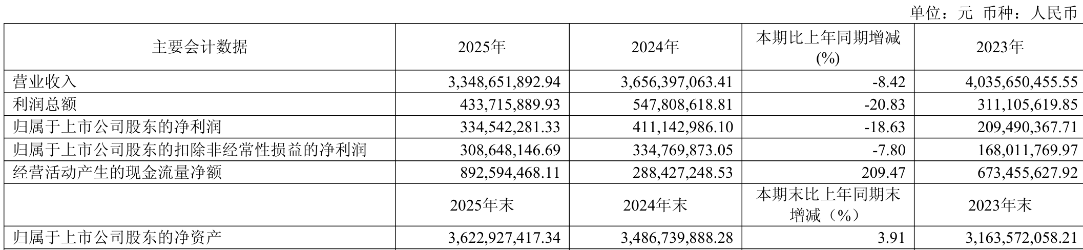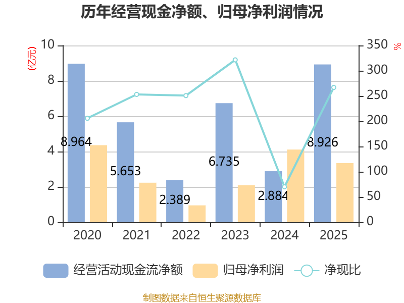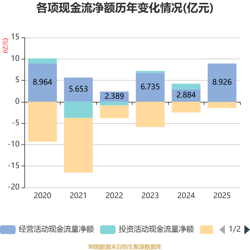 截至2025年,公司经营活动现金流净额为8.93亿元,同比增长209.47%;筹资活动现金流净额-1.44亿元,同比增加1.06亿元;投资活动现金流净额-336.83万元,上年同期为1.34亿元。