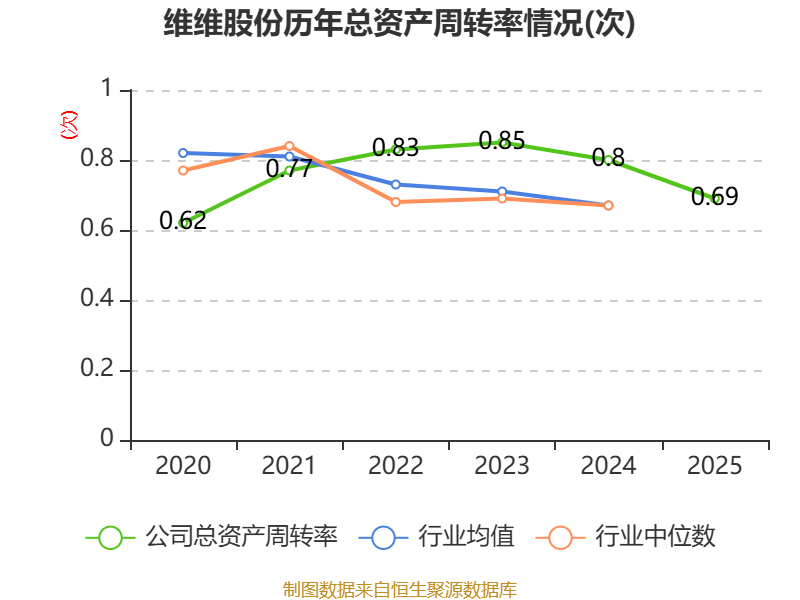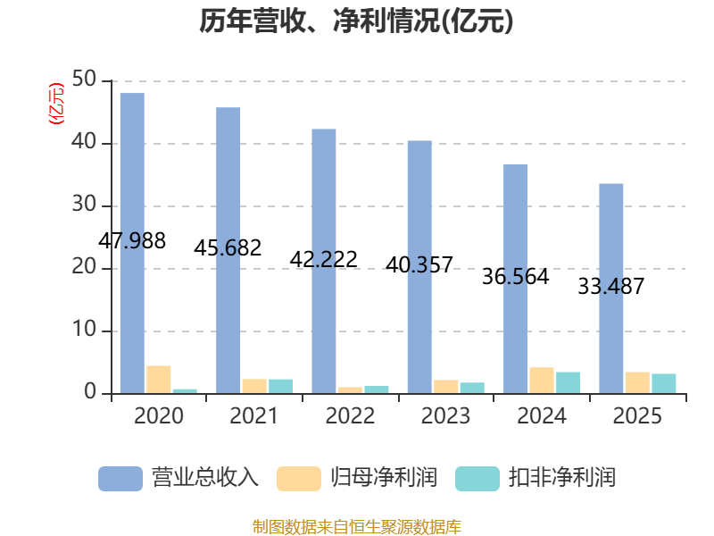 中证智能财讯维维股份(600300)4月11日披露2025年年度报告。2025年,公司实现营业总收入33.49亿元,同比下降8.42%;归母净利润3.35亿元,同比下降18.63%;扣非净利润3.09亿元,同比下降7.80%;经营活动产生的现金流量净额为8.93亿元,同比增长209.47%;报告期内,维维股份基本每股收益为0.21元,加权平均净资产收益率为9.47%。公司2025年度分配预案为:拟向全体股东每10股派现1.04元(含税)。