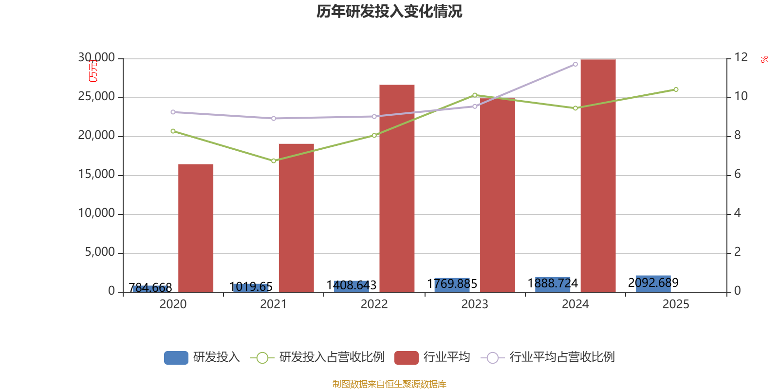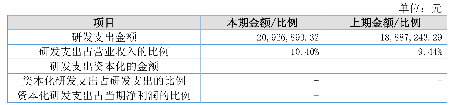 2025年全年,公司研发投入金额为2092.69万元,同比增长10.8%;研发投入占营业收入比例为10.4%,相比上年同期上升0.96个百分点。