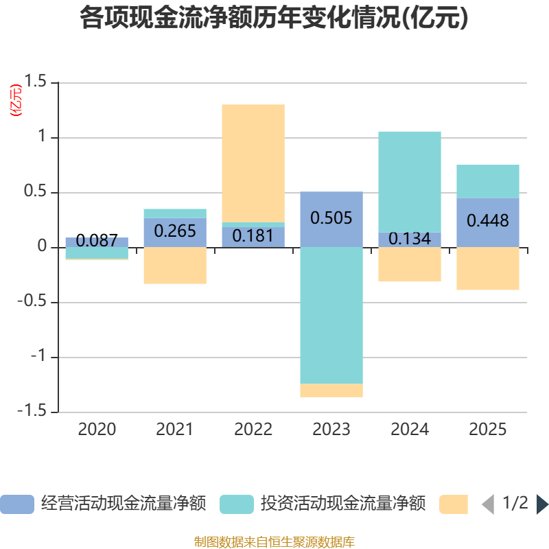 截至2025年,公司经营活动现金流净额为4479.96万元,同比增长235.53%;筹资活动现金流净额-3900万元,同比减少772.47万元;投资活动现金流净额3019.71万元,上年同期为9170.89万元。