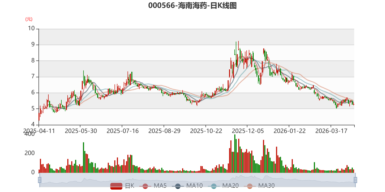 值得注意的是,中登公司数据显示,截至2026年4月3日,海南海药11.64%股份处于质押状态。年报显示,第一大股东海南华同实业有限公司质押1.48亿股公司股份,占其全部持股的50%。