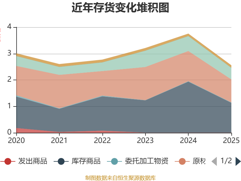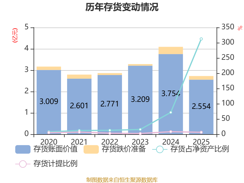 从存货变动来看,截至2025年末,公司存货账面价值为2.55亿元,占净资产的312.35%,较上年末减少1.2亿元。其中,存货跌价准备为1711.42万元,计提比例为6.28%。