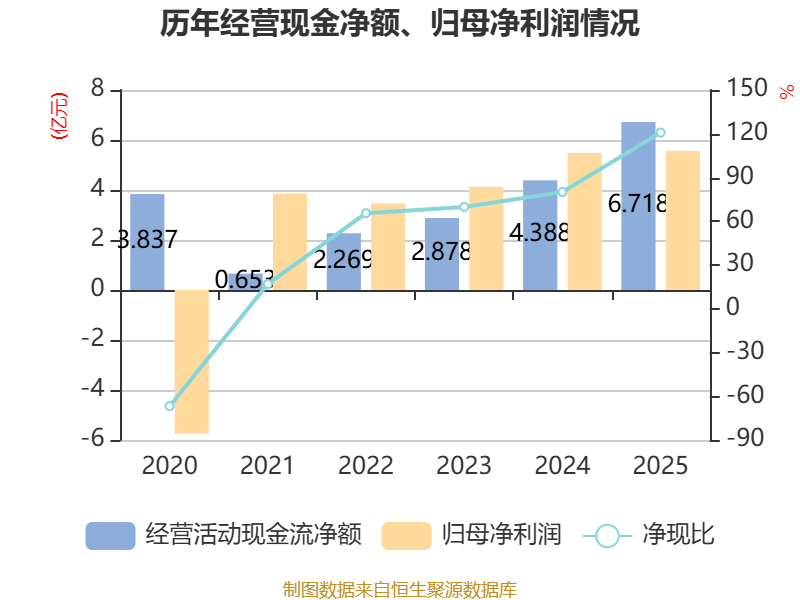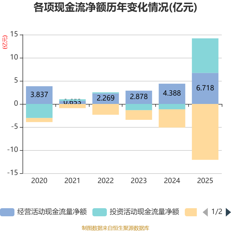 截至2025年,公司经营活动现金流净额为6.72亿元,同比增长53.1%;筹资活动现金流净额-12.09亿元,同比减少8.17亿元;投资活动现金流净额7.48亿元,上年同期为-1.17亿元。