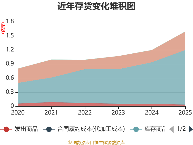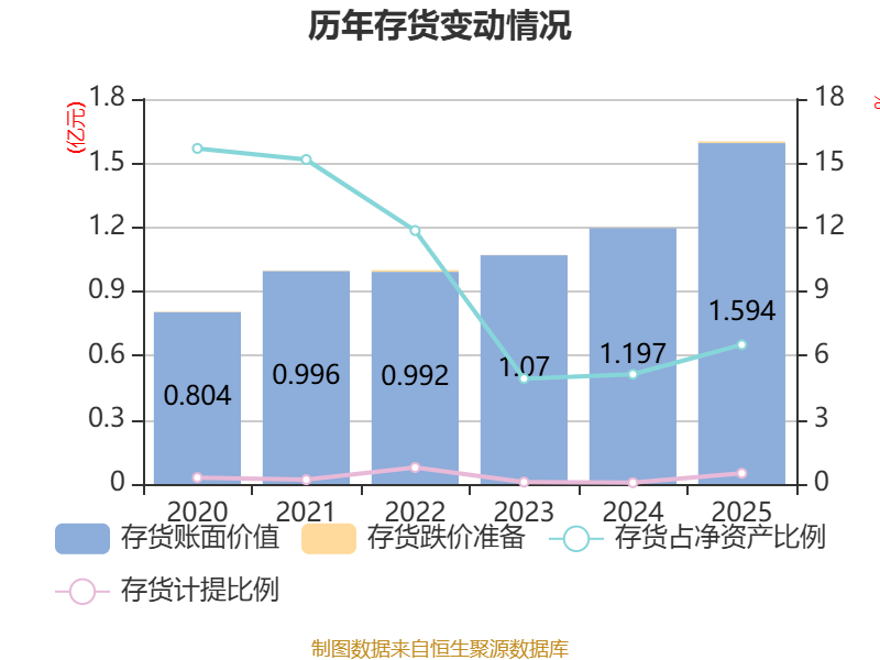 从存货变动来看,截至2025年末,公司存货账面价值为1.59亿元,占净资产的6.51%,较上年末增加3964.06万元。其中,存货跌价准备为80.1万元,计提比例为0.5%。