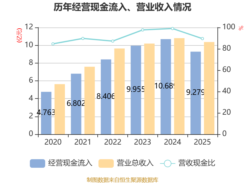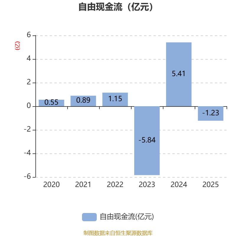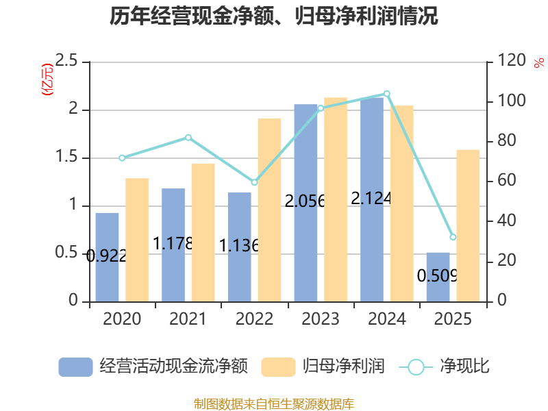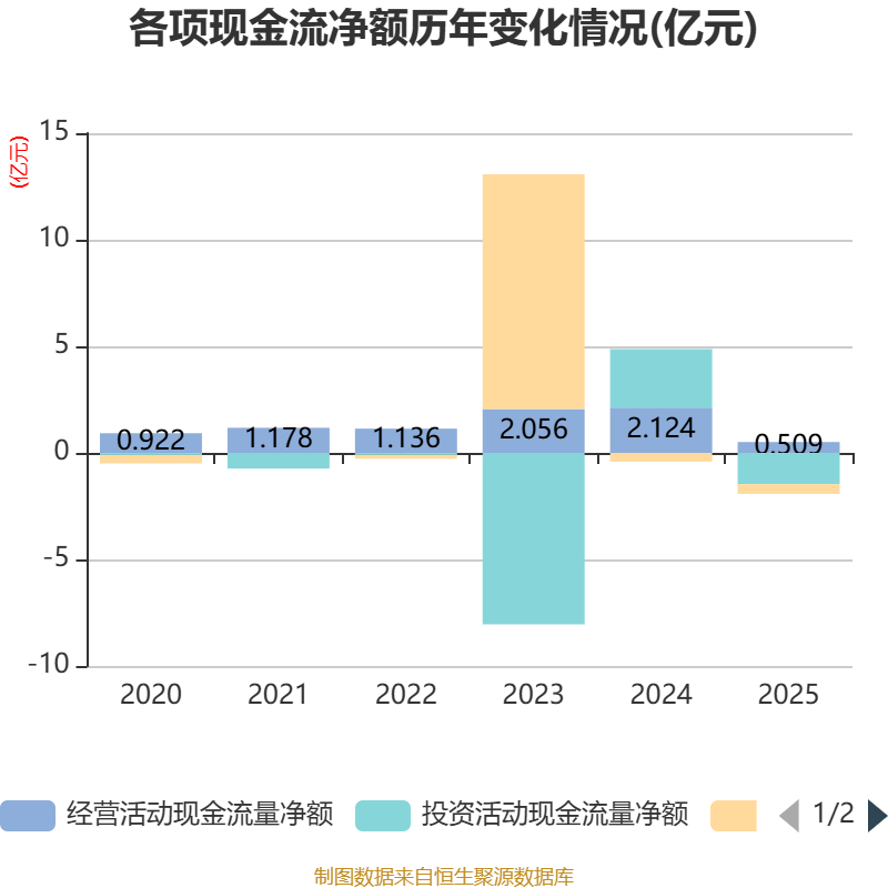 截至2025年,公司经营活动现金流净额为5090.08万元,同比下降76.04%;筹资活动现金流净额-4539.79万元,同比减少444.46万元;投资活动现金流净额-1.47亿元,上年同期为2.75亿元。