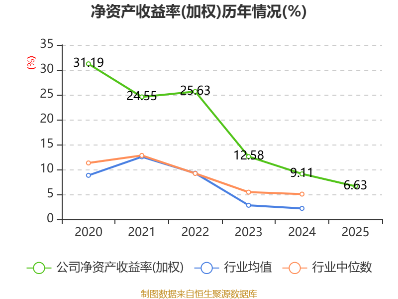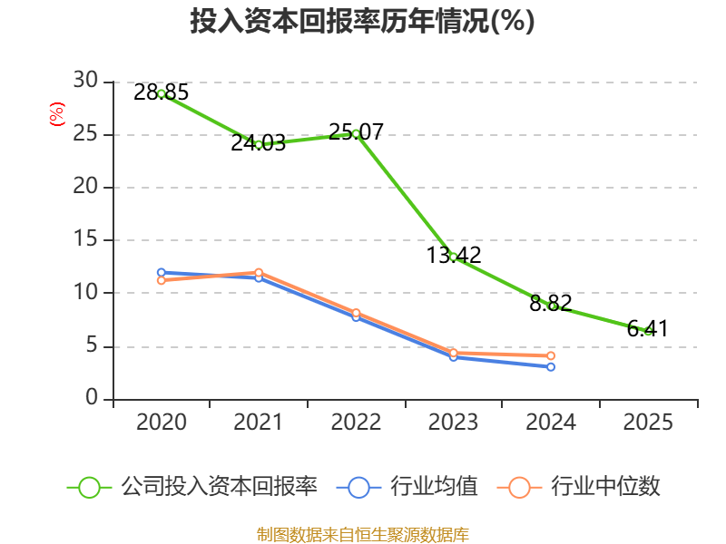 数据显示,2025年公司加权平均净资产收益率为6.63%,较上年同期下降2.48个百分点。公司2025年投入资本回报率为6.41%,较上年同期下降2.41个百分点。