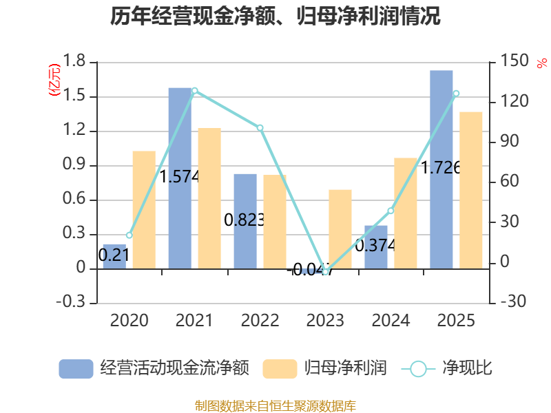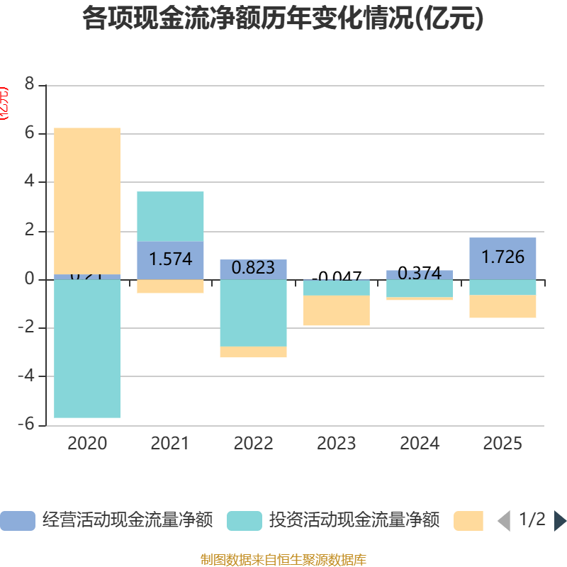 截至2025年,公司经营活动现金流净额为1.73亿元,同比增长361.45%;筹资活动现金流净额-9294.59万元,同比减少8205.14万元;投资活动现金流净额-6460.69万元,上年同期为-7356.32万元。