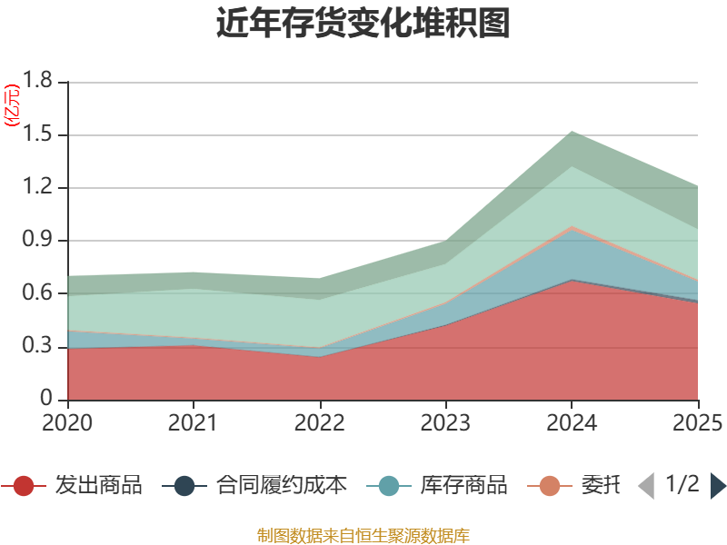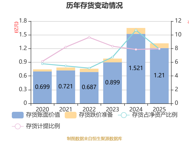 从存货变动来看,截至2025年末,公司存货账面价值为1.21亿元,占净资产的7.94%,较上年末减少3113.6万元。其中,存货跌价准备为1047.19万元,计提比例为7.97%。