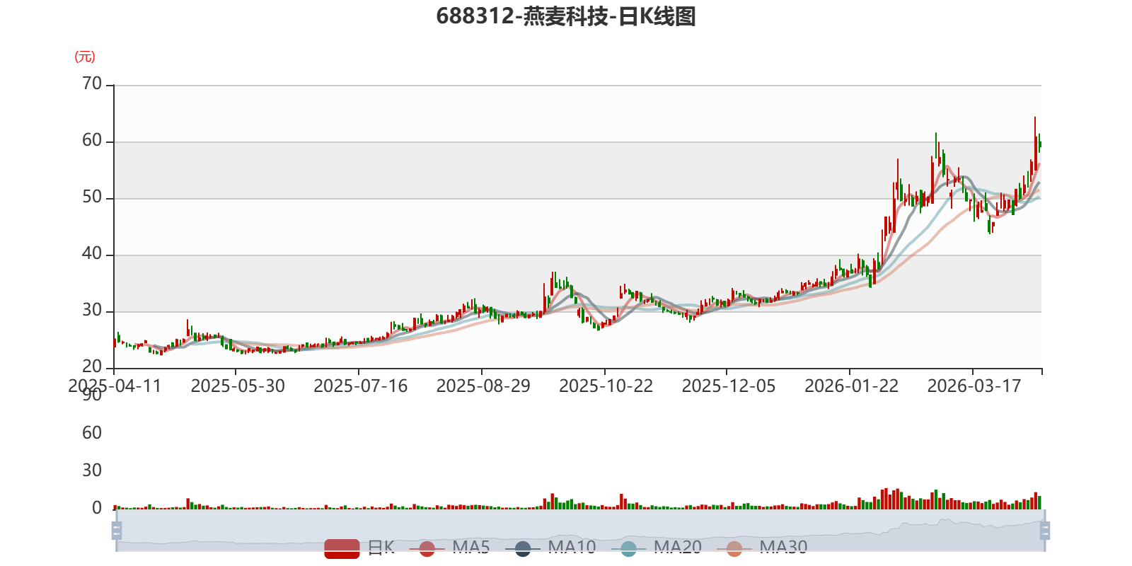 以4月10日收盘价计算,燕麦科技目前市盈率(TTM)约为63.14倍,市净率(LF)约5.65倍,市销率(TTM)约13.93倍。