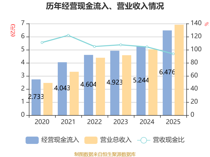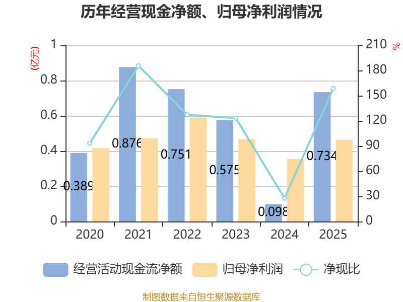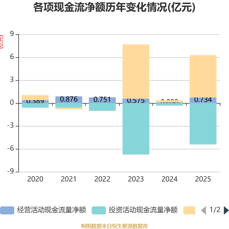 截至2025年,公司经营活动现金流净额为7342.66万元,同比增长645.82%;筹资活动现金流净额5.55亿元,同比增加5.27亿元;投资活动现金流净额-5.42亿元,上年同期为-3411.12万元。