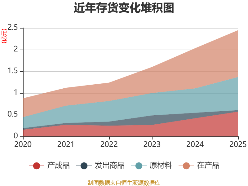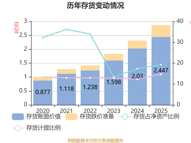 从存货变动来看,截至2025年末,公司存货账面价值为2.45亿元,占净资产的19.3%,较上年末增加4168.48万元。其中,存货跌价准备为4207.85万元,计提比例为14.67%。