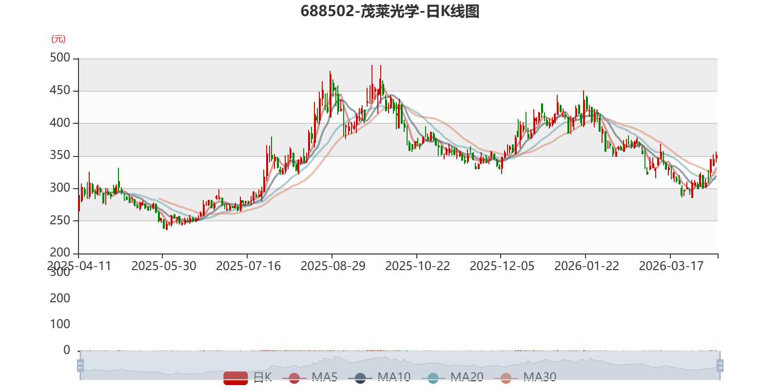 以4月10日收盘价计算,茂莱光学目前市盈率(TTM)约为400.01倍,市净率(LF)约14.62倍,市销率(TTM)约26.82倍。