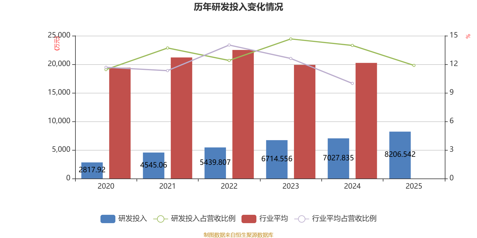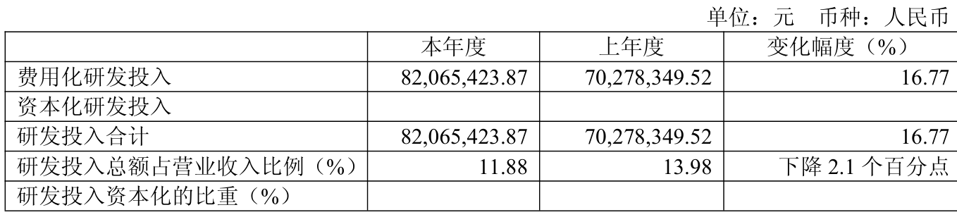 2025年全年,公司研发投入金额为8206.54万元,同比增长16.77%;研发投入占营业收入比例为11.88%,相比上年同期下降2.1个百分点。