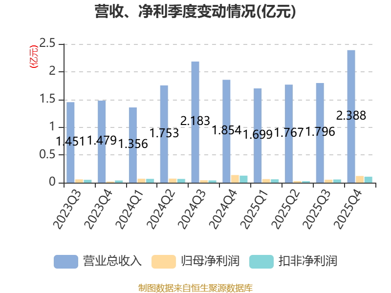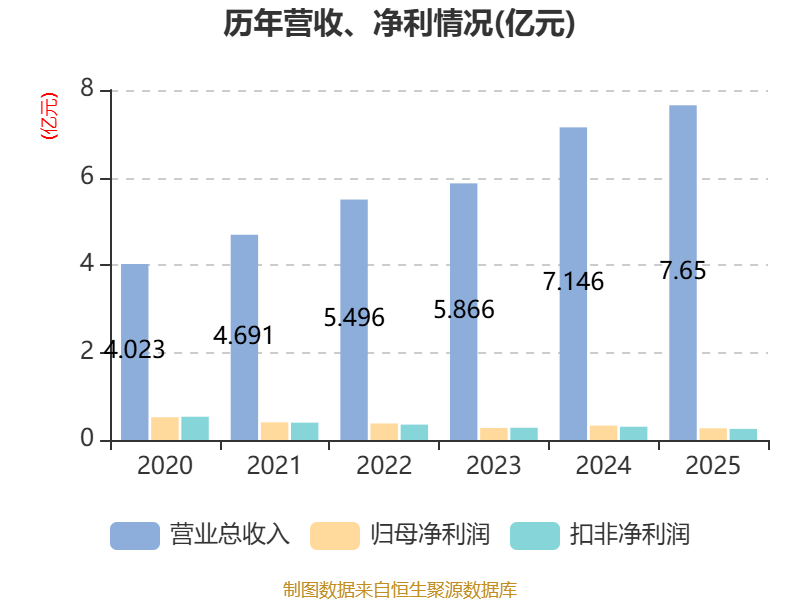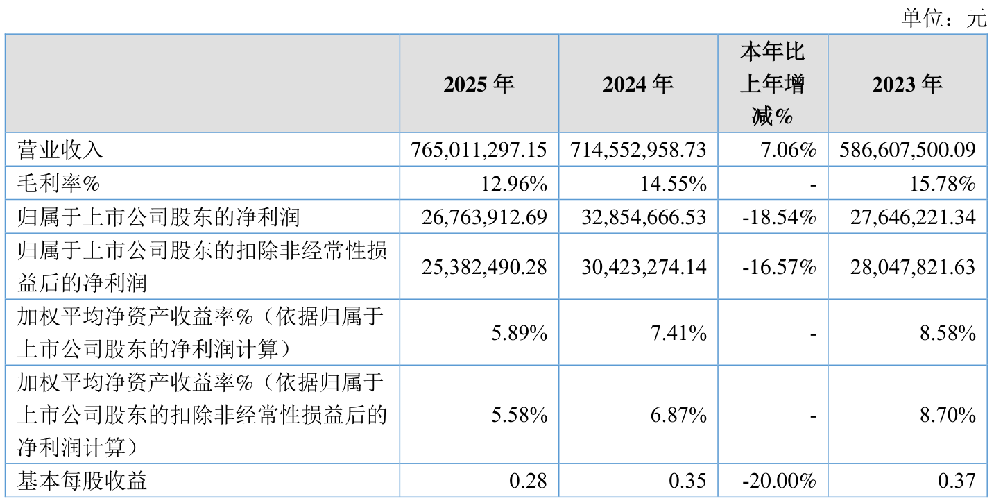 中证智能财讯力王股份(920627)4月10日披露2025年年度报告。2025年,公司实现营业总收入7.65亿元,同比增长7.06%;归母净利润2676.39万元,同比下降18.54%;扣非净利润2538.25万元,同比下降16.57%;经营活动产生的现金流量净额为4642.25万元,同比增长6.11%;报告期内,力王股份基本每股收益为0.28元,加权平均净资产收益率为5.89%。公司2025年度分配预案为:拟向全体股东每10股派现0.5元(含税)。