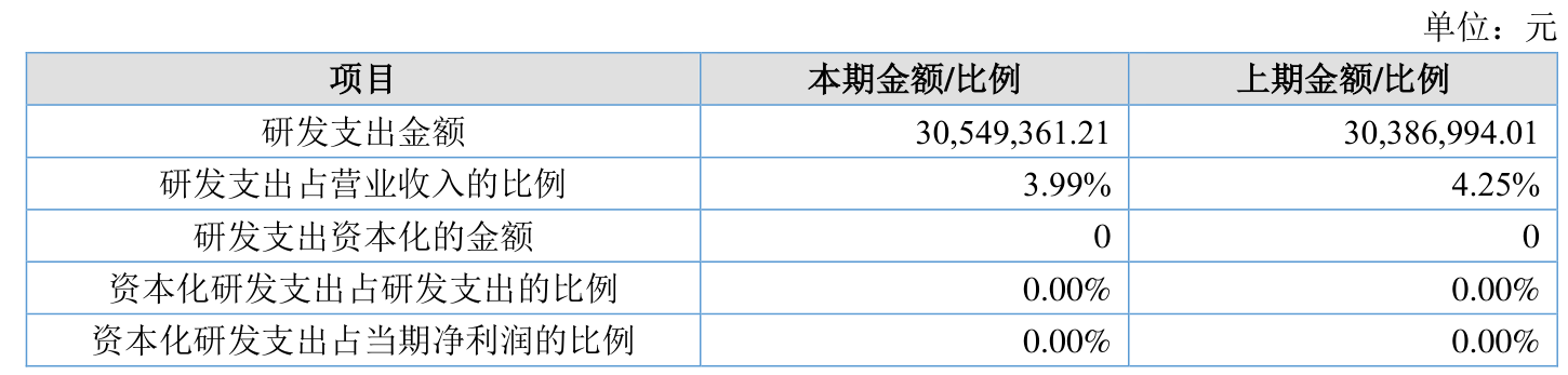 2025年全年,公司研发投入金额为3054.94万元,同比增长0.53%;研发投入占营业收入比例为3.99%,相比上年同期下降0.26个百分点。此外,公司全年研发投入资本化率为0%。
