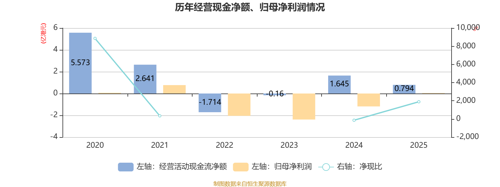 2025年,公司经营活动现金流净额为7942万港元,同比下降51.72%;筹资活动现金流净额325.5万港元,同比增加6974万港元;投资活动现金流净额-1.47亿港元,上年同期为-4751.8万港元。