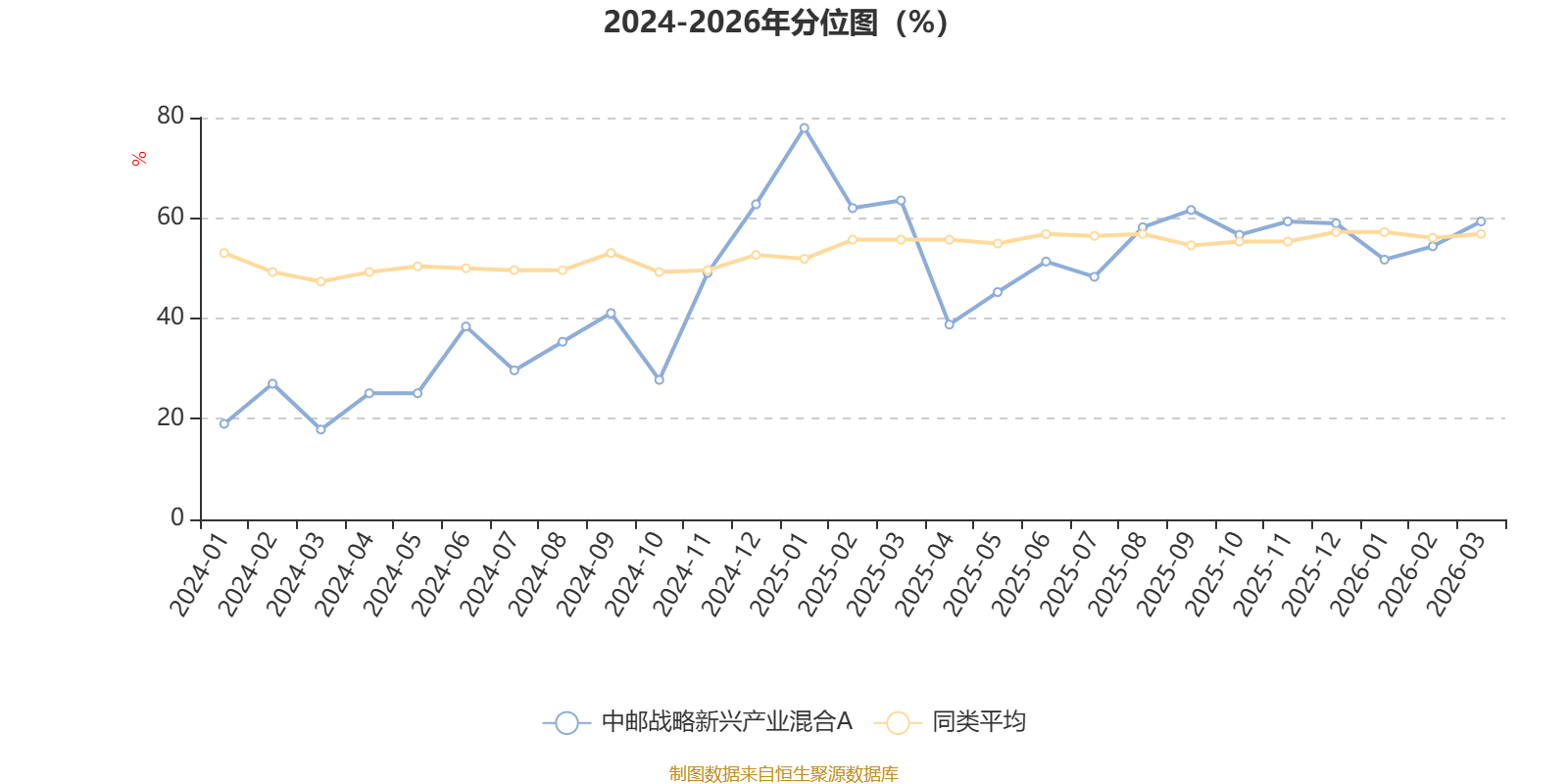 通过所选区间该基金净值增长率分位图,可以观察该基金与同类基金业绩比较情况。图为坐标原点到区间内某时点的净值增长率在同类基金中的分位数。