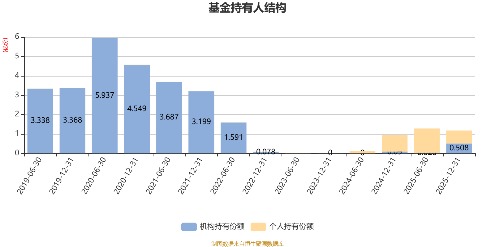 截至2025年12月31日,基金持有人共计1.64万户,合计持有1.18亿份。其中管理人员工持有9.62万份,占比0.08%,机构持有份额占比43.19%,个人投资者占比56.81%。