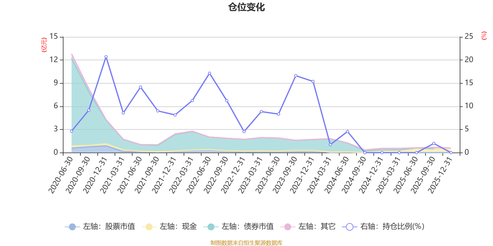 据定期报告数据统计,近三年平均股票仓位为4.79%,同类平均为19.11%。2020年末基金达到20.72%的最高仓位,2024年一季度末最低,为1.73%。