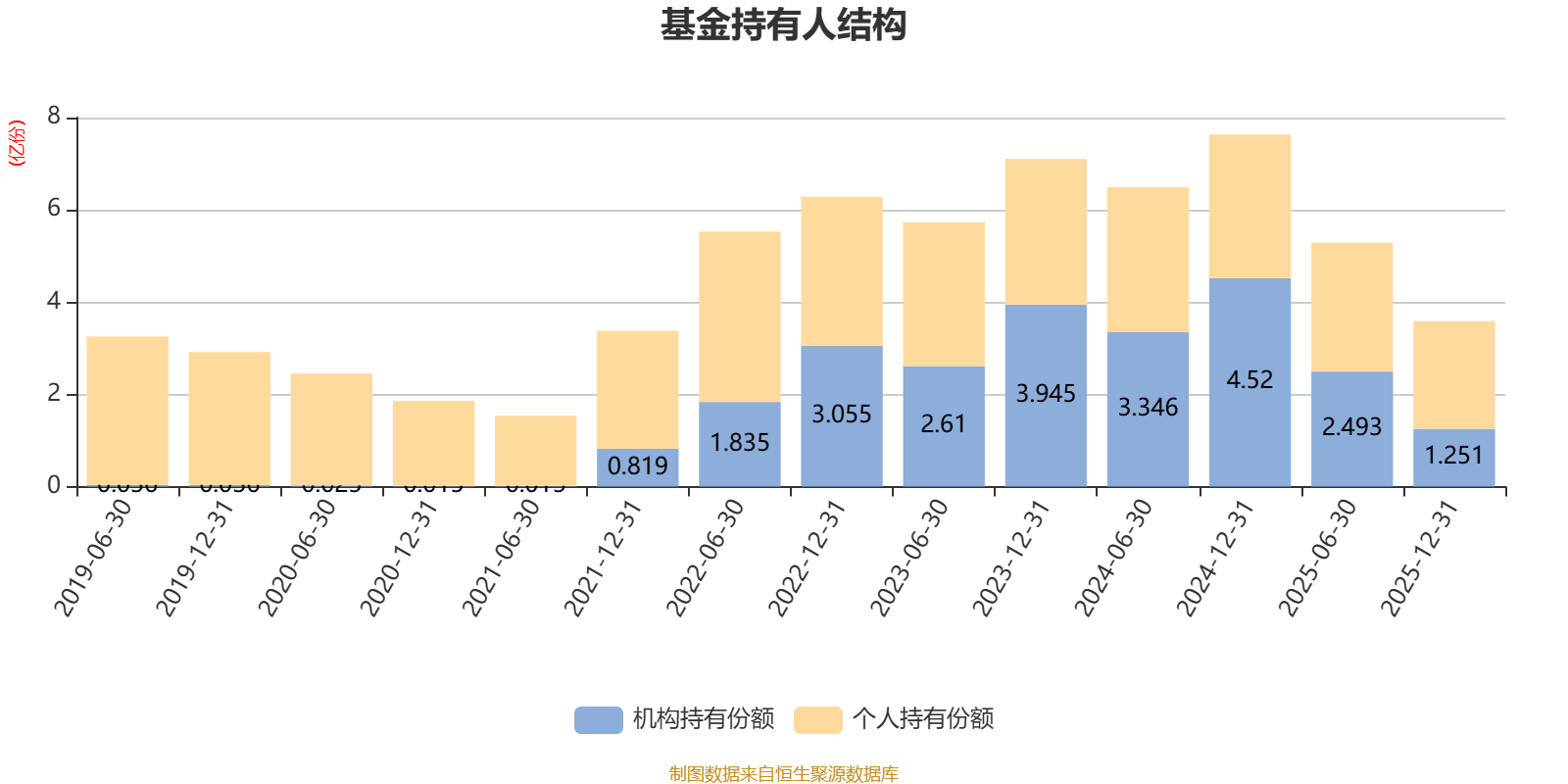 截至2025年12月31日,基金持有人共计3.95万户,合计持有3.59亿份。其中管理人员工持有4.97万份,占比0.01%,机构持有份额占比34.88%,个人投资者占比65.12%。