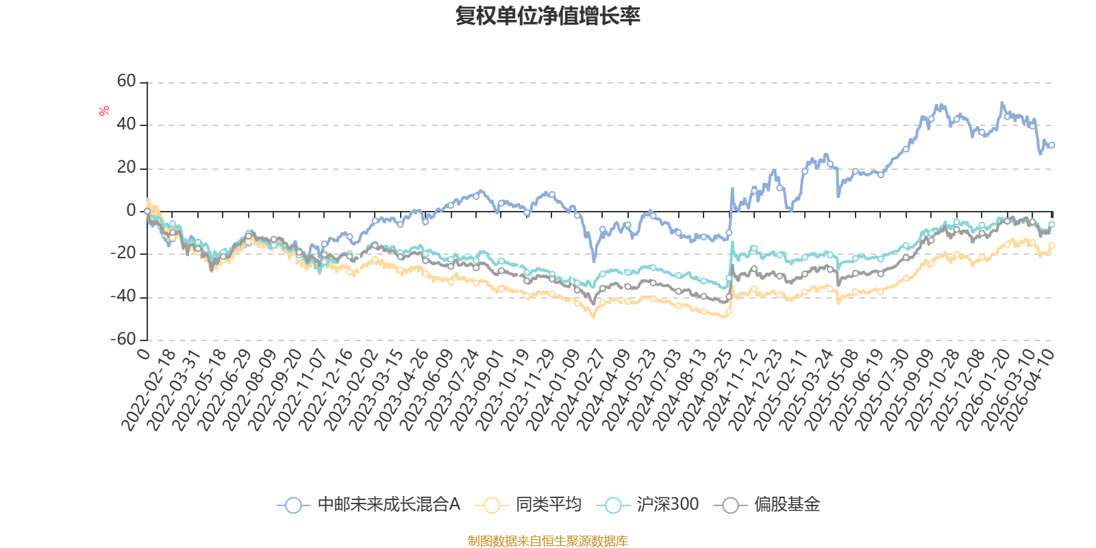 截至4月10日,中邮未来成长混合A近三个月复权单位净值增长率为-10.54%,位于同类可比基金583/621;近半年复权单位净值增长率为-10.76%,位于同类可比基金583/621;近一年复权单位净值增长率为16.84%,位于同类可比基金508/618;近三年复权单位净值增长率为32.07%,位于同类可比基金175/559。