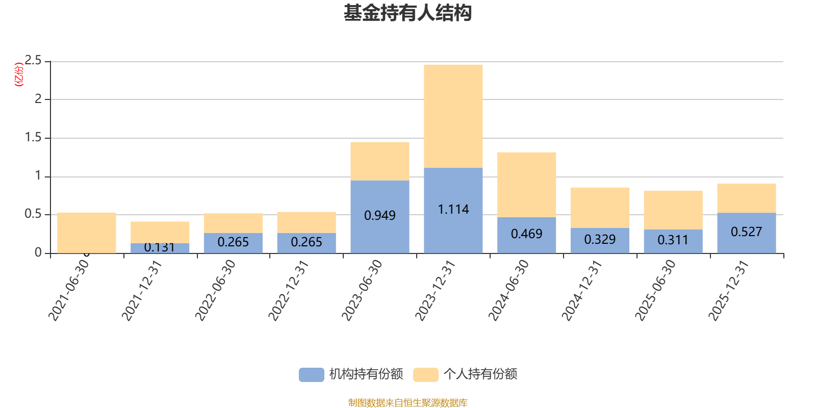 截至2025年12月31日,基金持有人共计1.71万户,合计持有9066.3万份。其中管理人员工持有77.07万份,占比0.85%,机构持有份额占比58.11%,个人投资者占比41.89%。