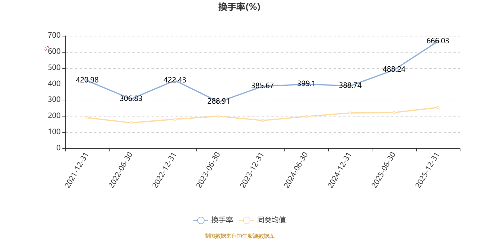 截至2025年12月31日,基金最近一年换手率约1169.94%,持续高于同类均值。