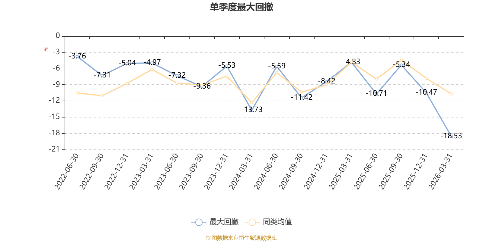 截至4月10日,基金近三年最大回撤为26.05%,同类可比基金排名70/124。单季度最大回撤出现在2026年一季度,为18.53%。