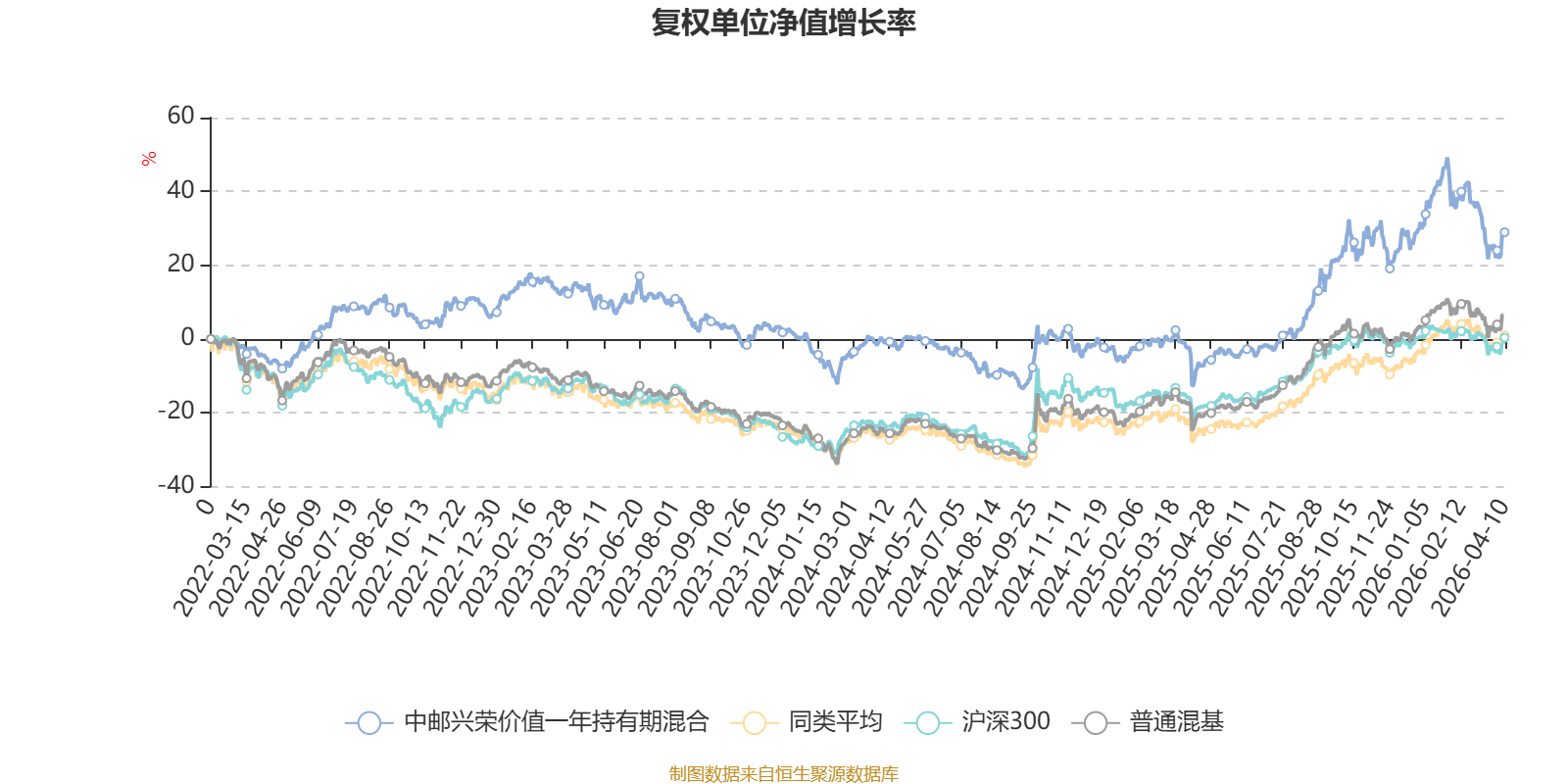 截至4月10日,中邮兴荣价值一年持有期混合近三个月复权单位净值增长率为-6.18%,位于同类可比基金123/134;近半年复权单位净值增长率为0.25%,位于同类可比基金95/134;近一年复权单位净值增长率为40.90%,位于同类可比基金39/134;近三年复权单位净值增长率为13.22%,位于同类可比基金70/126。