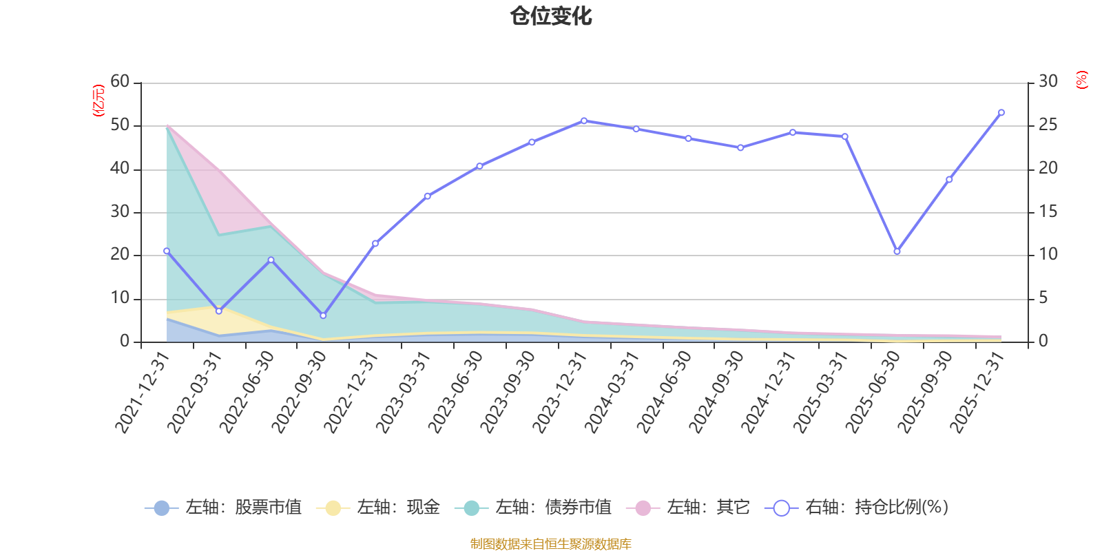 据定期报告数据统计,近三年平均股票仓位为21.71%,同类平均为19.2%。2025年末基金达到26.55%的最高仓位,2022年三季度末最低,为3.05%。