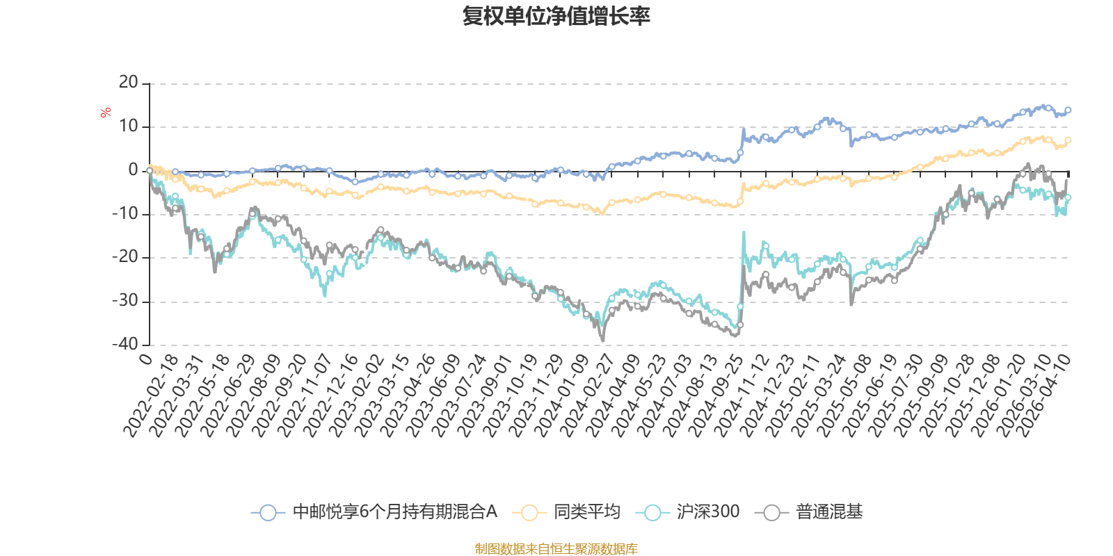 截至4月10日,中邮悦享6个月持有期混合A近三个月复权单位净值增长率为0.97%,位于同类可比基金170/629;近半年复权单位净值增长率为3.45%,位于同类可比基金124/629;近一年复权单位净值增长率为6.57%,位于同类可比基金343/629;近三年复权单位净值增长率为13.98%,位于同类可比基金201/581。