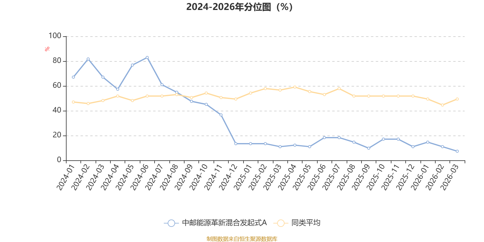 通过所选区间该基金净值增长率分位图,可以观察该基金与同类基金业绩比较情况。图为坐标原点到区间内某时点的净值增长率在同类基金中的分位数。