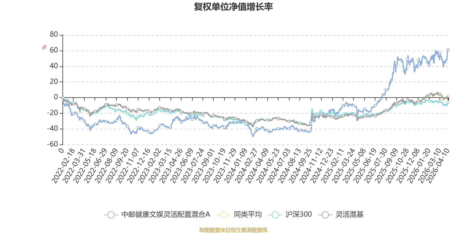 截至4月10日,中邮健康文娱灵活配置混合A近三个月复权单位净值增长率为8.54%,位于同类可比基金145/1287;近半年复权单位净值增长率为15.82%,位于同类可比基金191/1286;近一年复权单位净值增长率为95.76%,位于同类可比基金80/1286;近三年复权单位净值增长率为118.97%,位于同类可比基金27/1286。