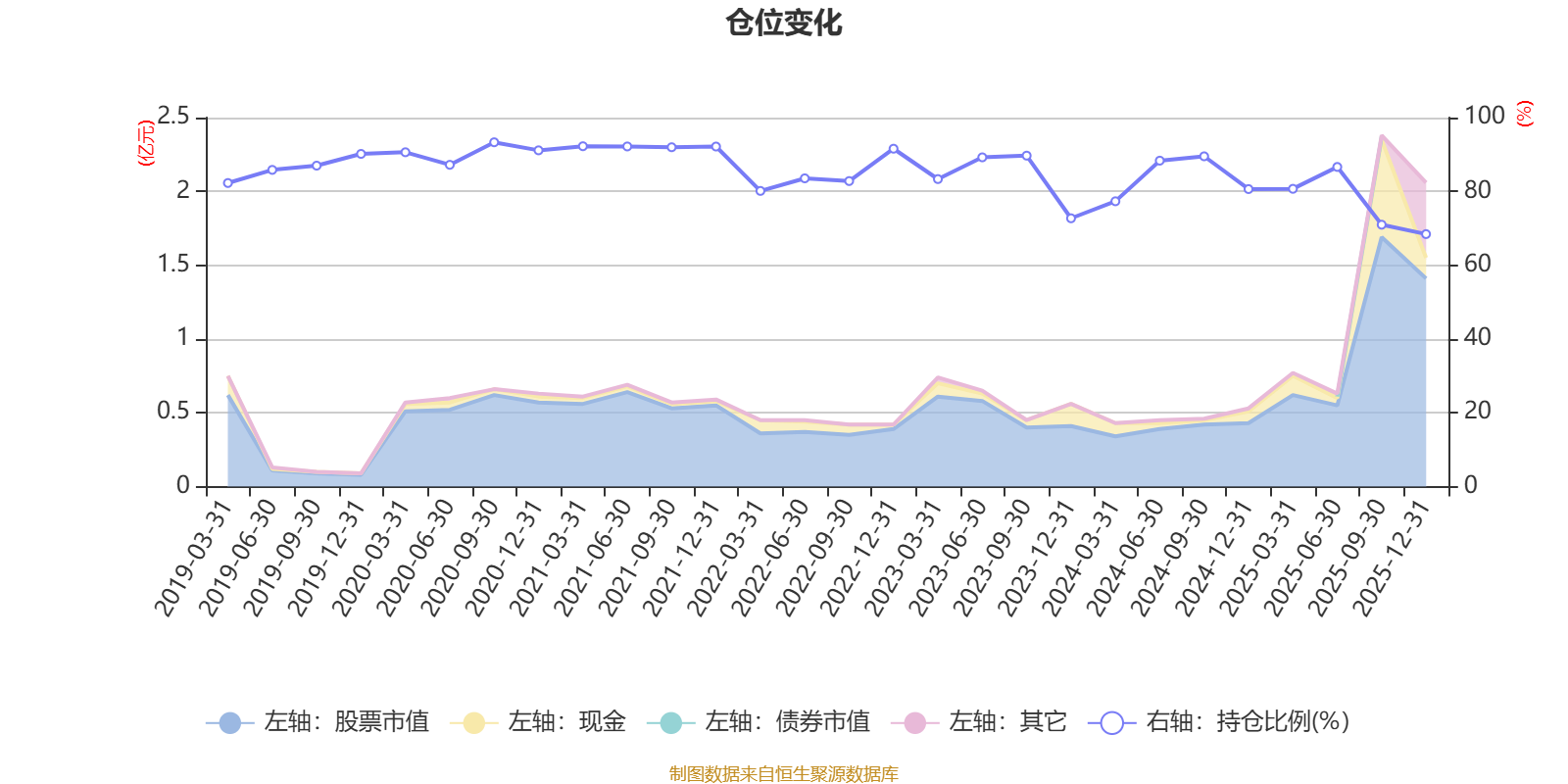 据定期报告数据统计,近三年平均股票仓位为81.46%,同类平均为72.57%。2020年三季度末基金达到93.31%的最高仓位,2025年末最低,为68.43%。