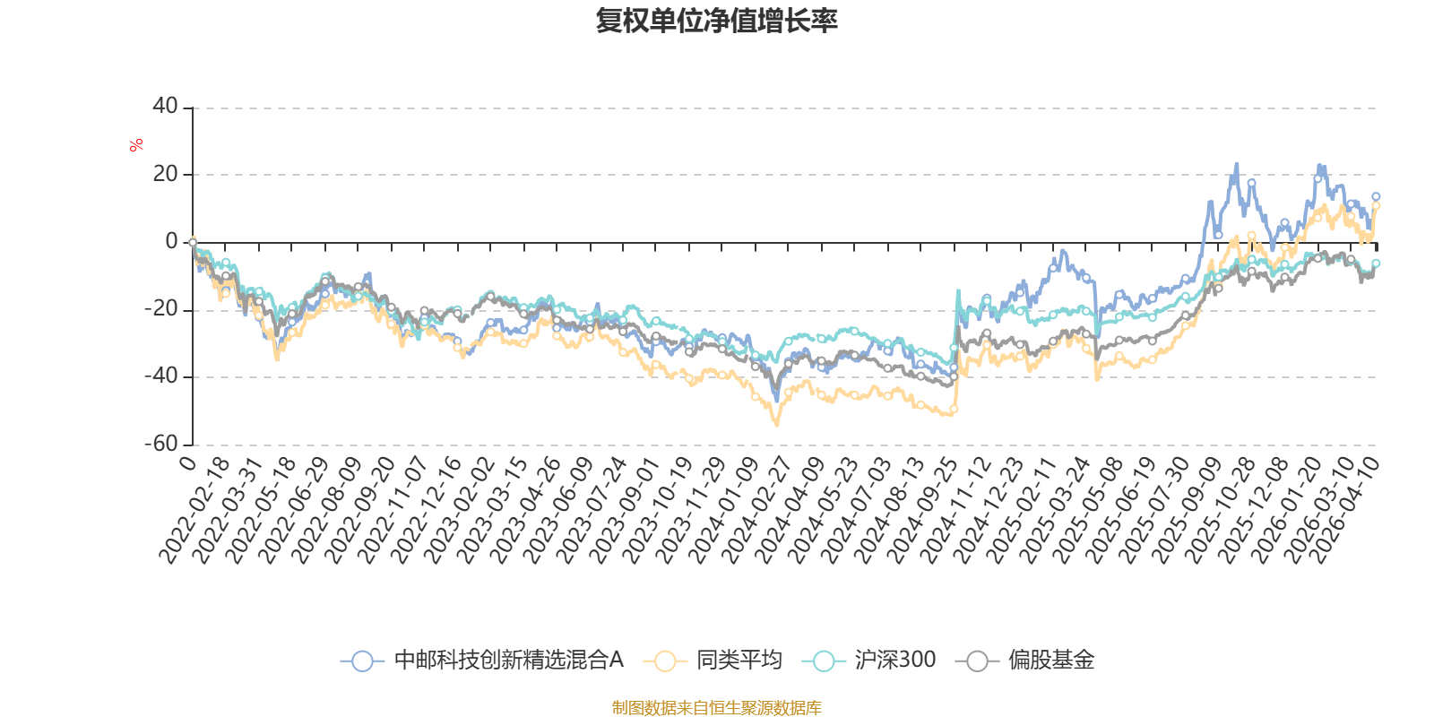 截至4月10日,中邮科技创新精选混合A近三个月复权单位净值增长率为2.45%,位于同类可比基金124/229;近半年复权单位净值增长率为-2.45%,位于同类可比基金184/229;近一年复权单位净值增长率为50.62%,位于同类可比基金148/229;近三年复权单位净值增长率为39.82%,位于同类可比基金103/172。