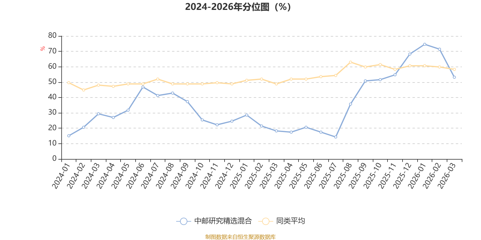 通过所选区间该基金净值增长率分位图,可以观察该基金与同类基金业绩比较情况。图为坐标原点到区间内某时点的净值增长率在同类基金中的分位数。