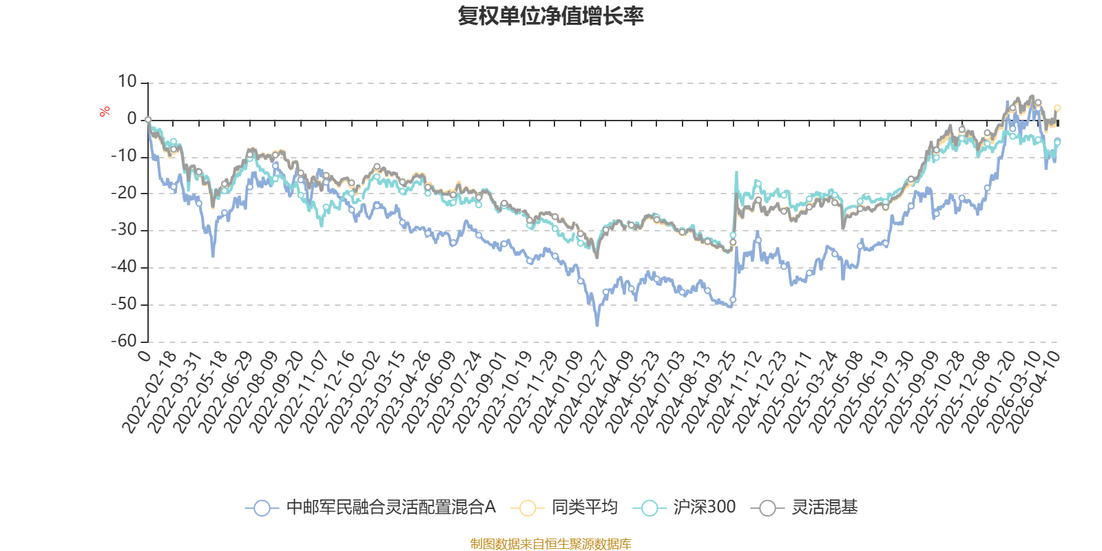 截至4月10日,中邮军民融合灵活配置混合A近三个月复权单位净值增长率为-5.38%,位于同类可比基金1068/1287;近半年复权单位净值增长率为19.94%,位于同类可比基金123/1286;近一年复权单位净值增长率为54.69%,位于同类可比基金296/1286;近三年复权单位净值增长率为32.83%,位于同类可比基金340/1286。