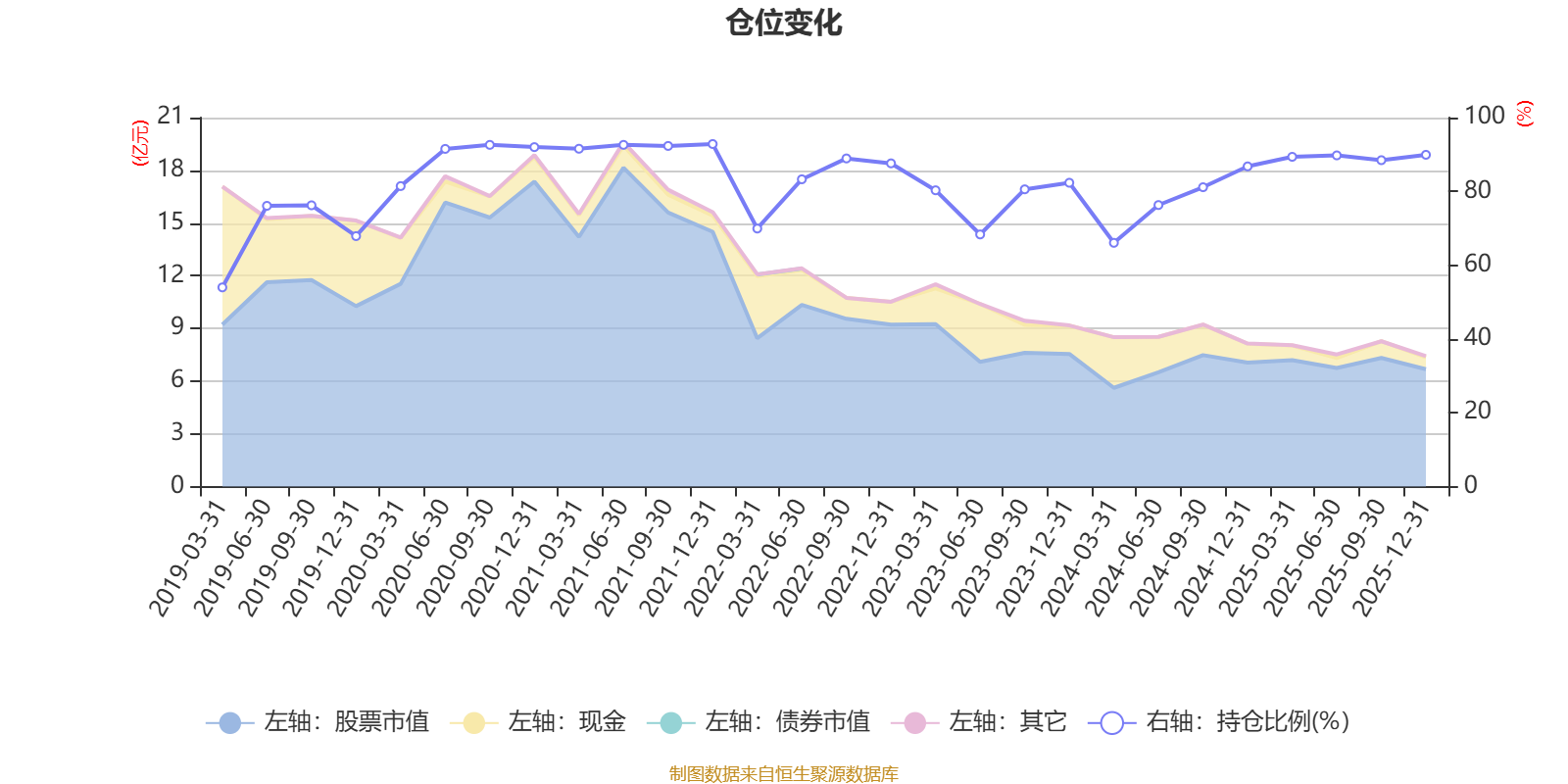 据定期报告数据统计,近三年平均股票仓位为81.61%,同类平均为72.57%。2021年末基金达到92.84%的最高仓位,2019年一季度末最低,为53.98%。