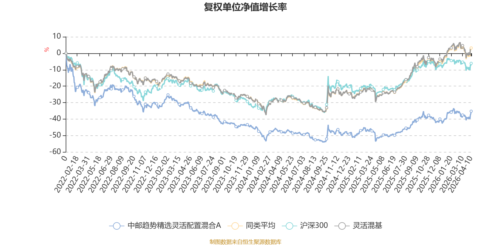 截至4月10日,中邮趋势精选灵活配置混合A近三个月复权单位净值增长率为1.38%,位于同类可比基金469/1287;近半年复权单位净值增长率为3.52%,位于同类可比基金664/1286;近一年复权单位净值增长率为34.78%,位于同类可比基金549/1286;近三年复权单位净值增长率为-7.24%,位于同类可比基金1089/1286。