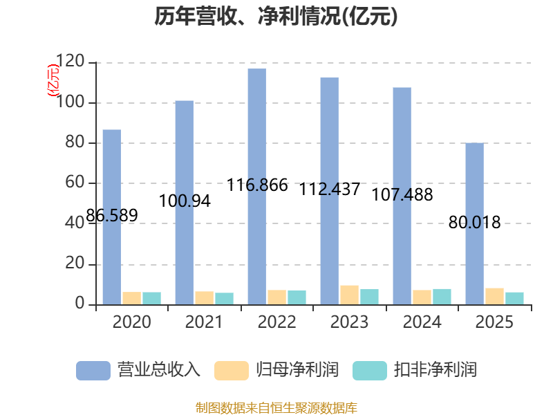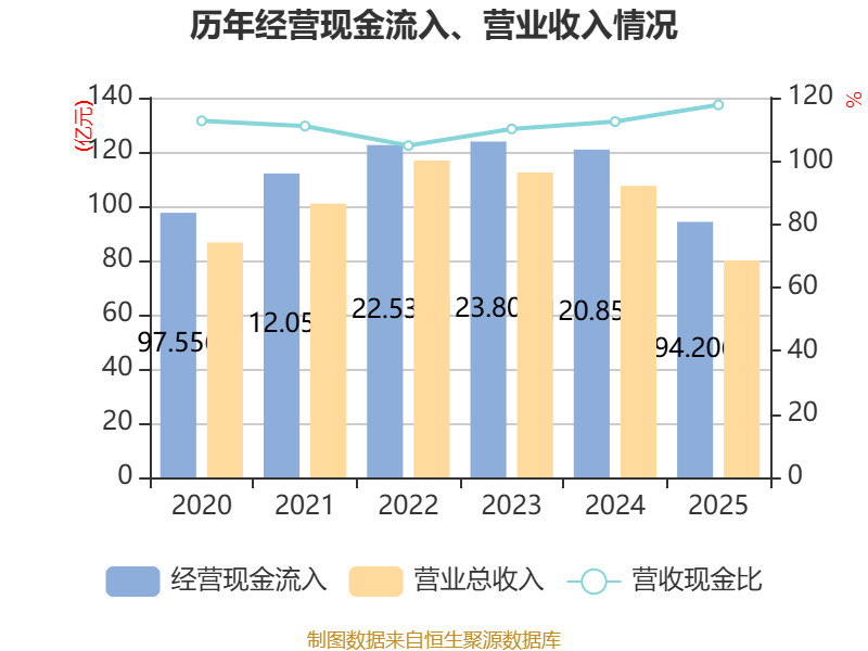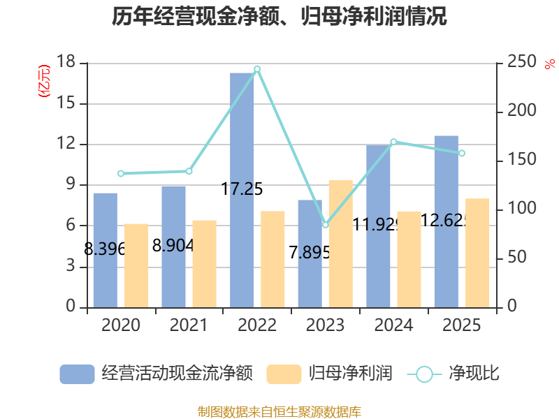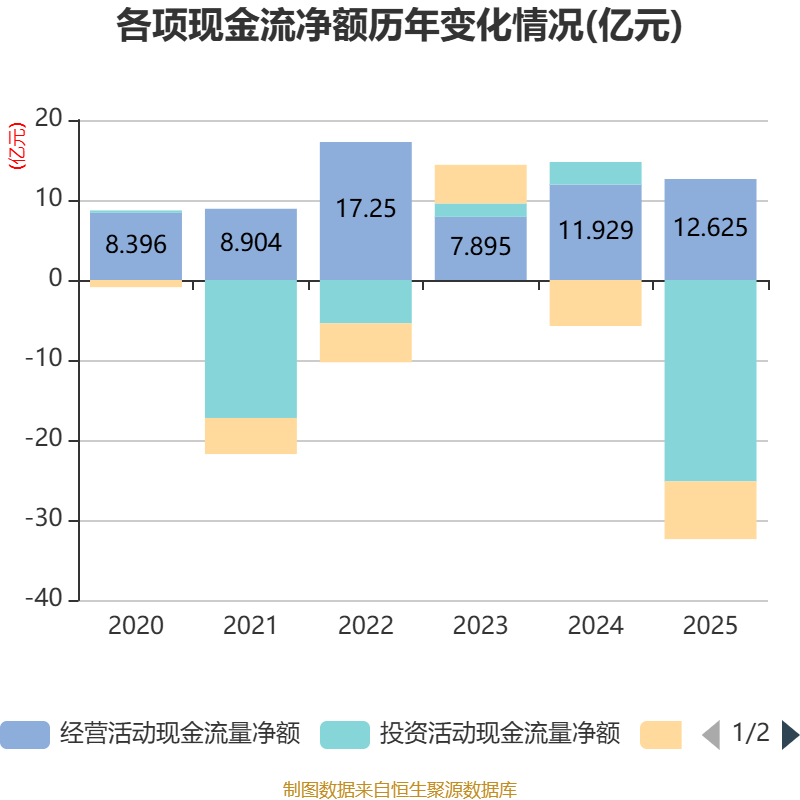 截至2025年,公司经营活动现金流净额为12.63亿元,同比增长5.83%;筹资活动现金流净额-7.21亿元,同比减少1.46亿元;投资活动现金流净额-25.17亿元,上年同期为2.82亿元。