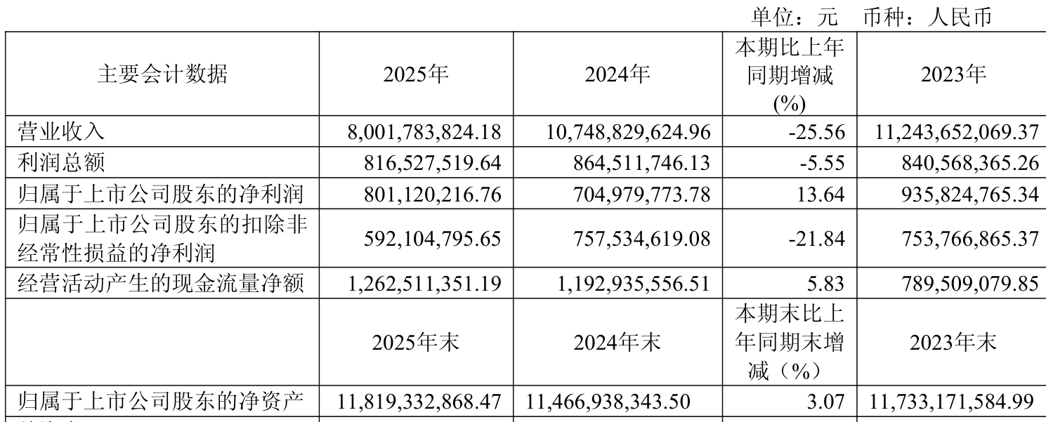 中证智能财讯皖新传媒(601801)4月11日披露2025年年度报告。2025年,公司实现营业总收入80.02亿元,同比下降25.56%;归母净利润8.01亿元,同比增长13.64%;扣非净利润5.92亿元,同比下降21.84%;经营活动产生的现金流量净额为12.63亿元,同比增长5.83%;报告期内,皖新传媒基本每股收益为0.41元,加权平均净资产收益率为6.86%。公司2025年度分配预案为:拟向全体股东每10股派现2元(含税)。