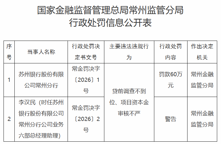 苏州银行被罚60万元