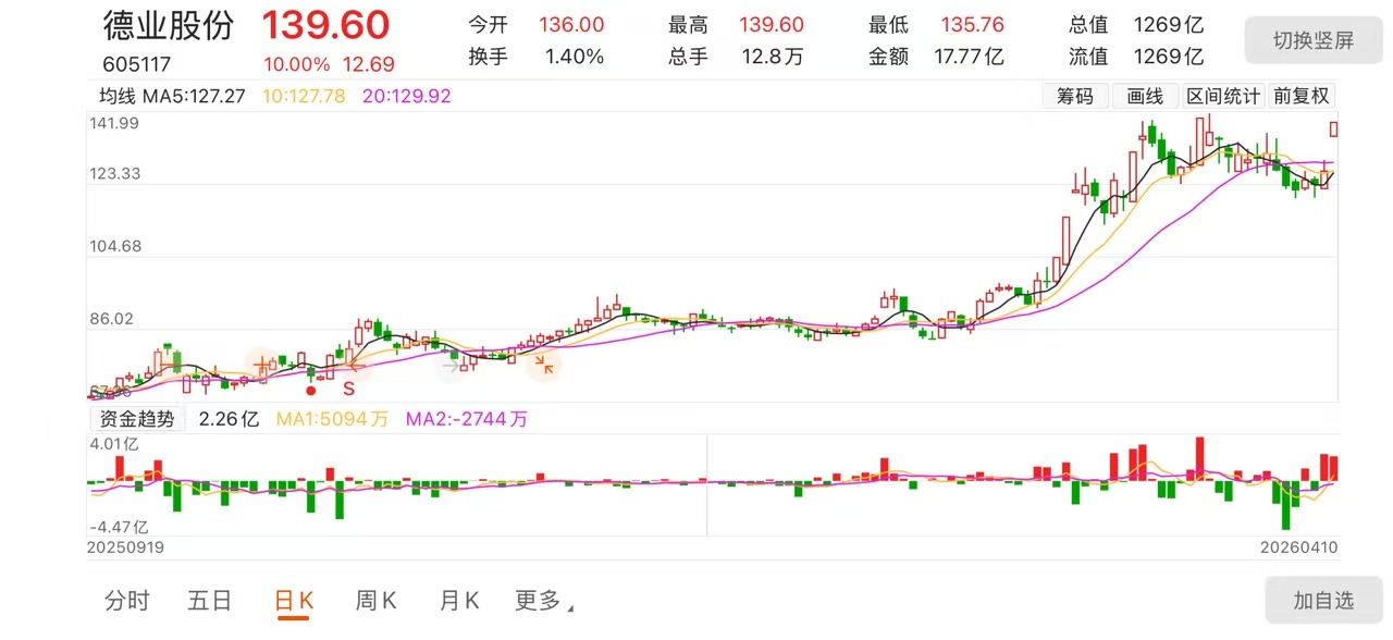 受业绩提振,4月10日德业股份股价直线涨停,收于139.6元/股,总市值升至1269.43亿元。