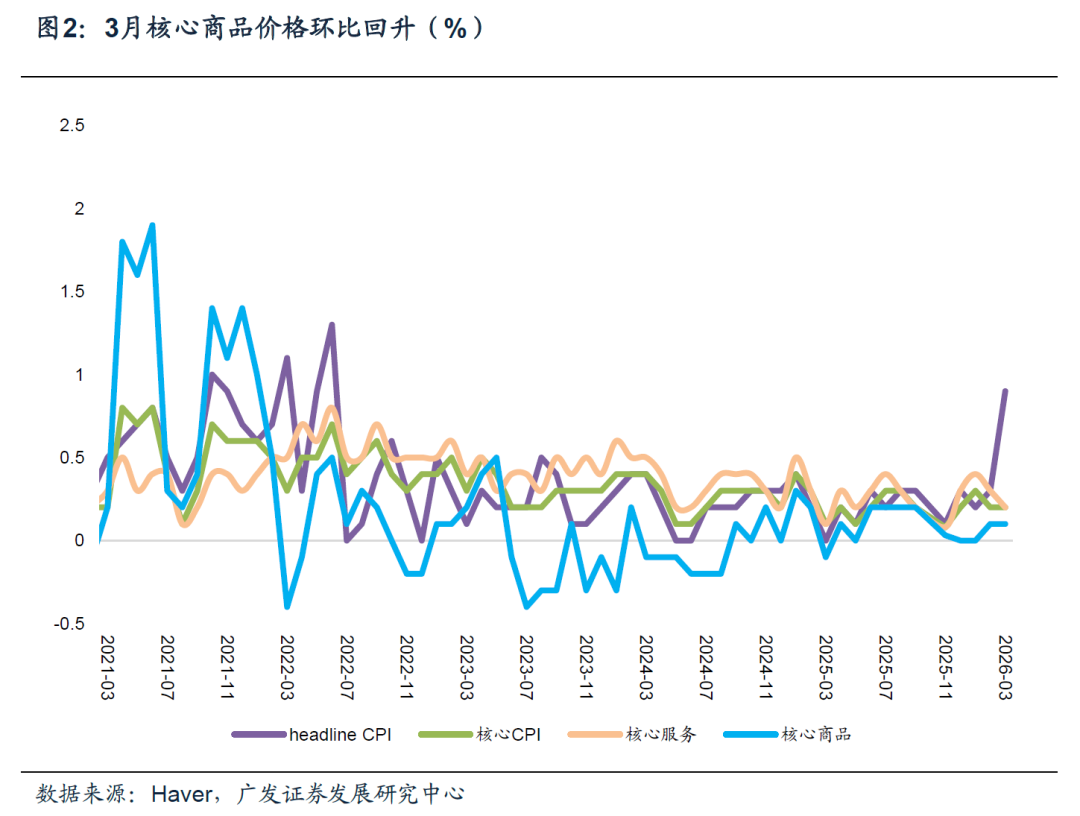 第一,2026年3月美国CPI同比增3.3%,持平于预期,前值2.4%,油价跳升为主要背景;核心CPI同比2.6%,略低于预期的2.7%,前值2.5%。基于3月CPI数据,Cleveland Fed预计3月PCE环比0.6%,前值0.4%,同比3.4%,前值2.8%。简单来看,一是地缘政治冲突下的油价推高美国通胀;二是市场对于通胀中枢走高已有较充分预期;三是其核心CPI尚大致可控。