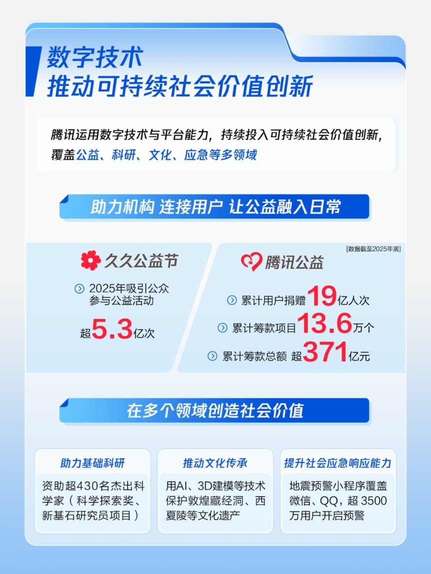 在助力基础科研、推动文化传承、提升社会应急响应能力等方面,腾讯也持续投入。据悉,科学探索奖和新基石研究员项目至今已资助超430名杰出科学家;对于敦煌藏经洞、西夏陵、甲骨文等文化遗产,腾讯利用AI、3D建模、游戏引擎等技术助力其保护与传承;全国地震预警小程序继在微信上线后,于去年登录QQ,目前共有超3500万用户开启预警。