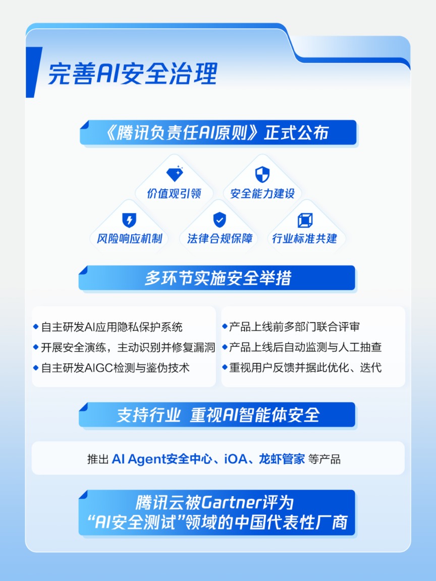 腾讯对AI安全的重视由来已久,早在2018年就提出了相关的治理原则,并以不同方式在各个环节实施AI安全治理,如自主研发AI应用隐私保护系统、自主研发AIGC检测与鉴伪技术、多次开展大规模AI安全演练等。针对近期“龙虾”等AI智能体的快速发展,腾讯也推出AI Agent安全中心、iOA、龙虾管家等,助力企业、个人安全、平稳地使用“龙虾”,支持行业中AI技术应用的安全治理。