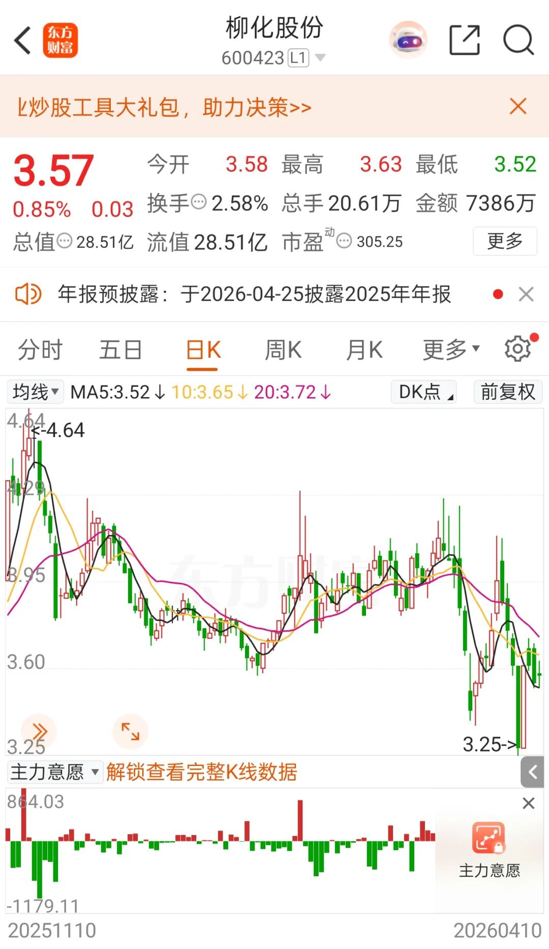 截至4月10日收盘,柳化股份报3.57元/股,总市值为28.51亿元。