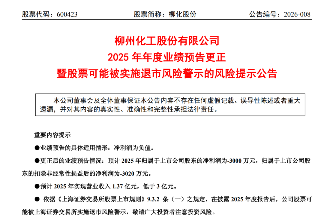 根据公告,柳化股份对2025年年度业绩预告进行重大更正。