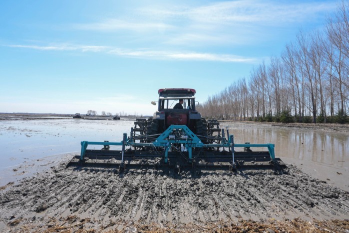 这是4月9日拍摄的黑龙江北大荒农业股份有限公司友谊分公司水稻田整地作业现场(无人机照片)。新华社记者王松摄